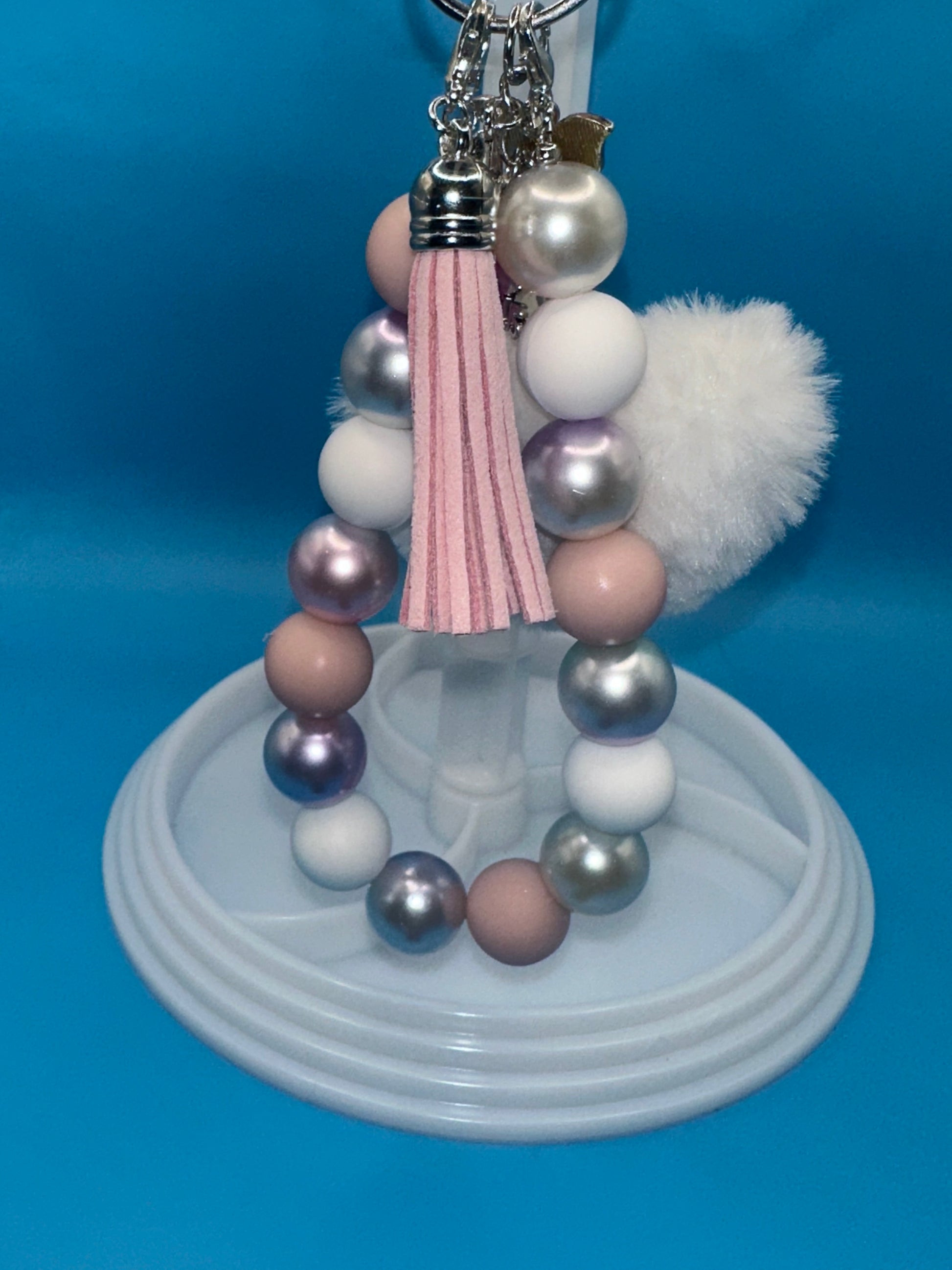 Handmade beaded keychain with heart pom-pom & multiple charms.